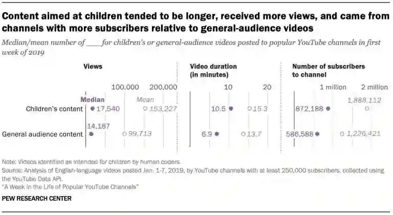 儿童向内容的平均播放量为15.3万次,其它题材的平均播放量约为10万。儿童向的博主也有更多粉丝,平均下来,儿童向和非儿童向的博主粉丝分别为190万和120万。儿童向视频中,半数时长超过11分钟,非儿童向视频的平均时长为7分钟。