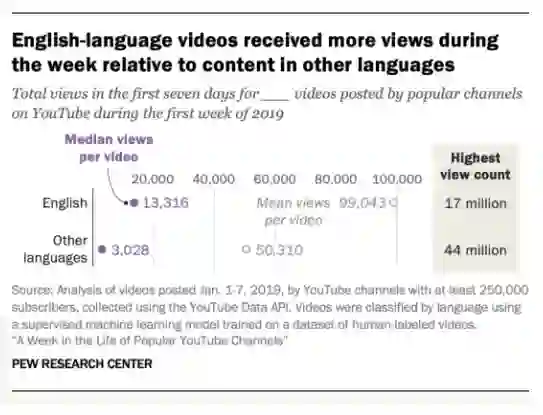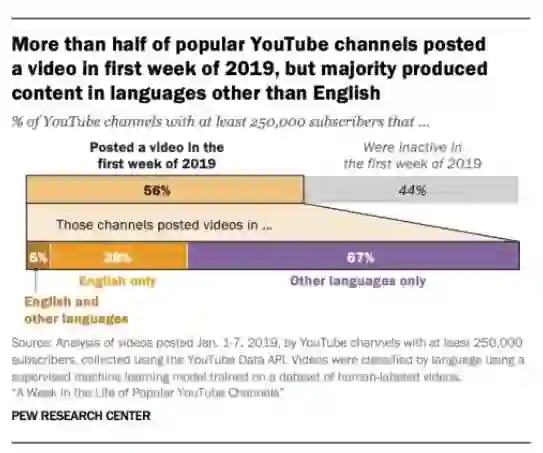 2. YouTube的流行是全球性的,最火爆的内容来自于一个非英语频道。通过手动标记和机器学习的方式分辨视频的语言发现,统计周期内,56%的博主都发布了视频,其中72%的博主至少发布了一个非英语视频。仅有17%的视频为全英文,约4.25万条。