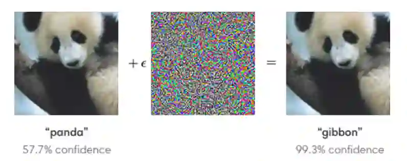 熟悉 Adversarial Machine Learning(对抗性机器学习)的朋友可能不会觉得陌生,早在 2013 年由 Christian Szegedy 等人就在论文 Intriguing properties of neural networks 中首次提出了 Adversarial Examples(对抗样本)的概念。而下面这张将大熊猫变成长臂猿的示例图也多次出现在多种深度学习课程中。