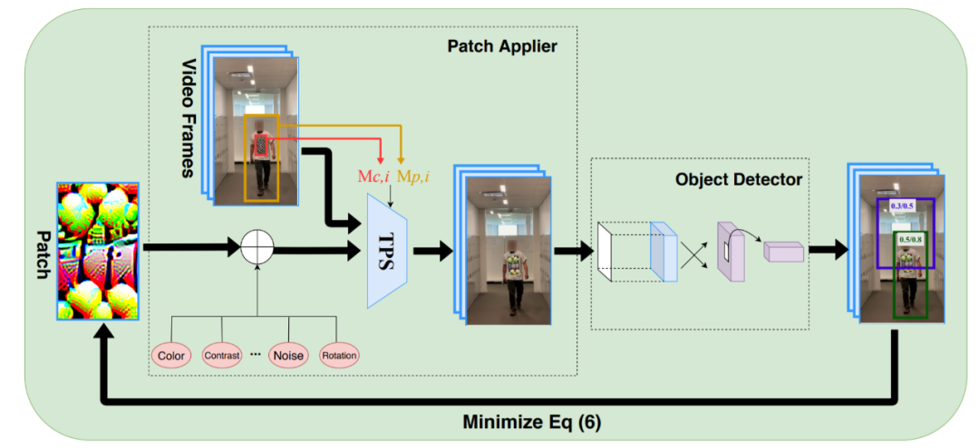 通过增强的 EOT 和颜色转换系统,最小化 YOLOV2 的检测置信度,最终得到一个对抗样本。