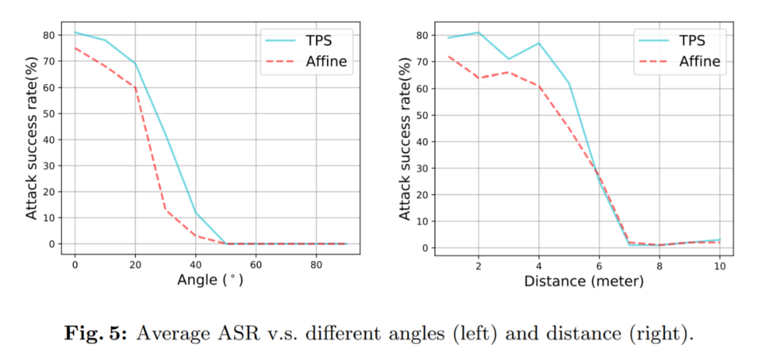 最终,在现实世界中,该方法利用 TPS 生成的样本对抗 YOLOV2 可以达到 57% 的攻击成功率,相较而言,仅使用仿射变换只能达到 37% 攻击成功率。