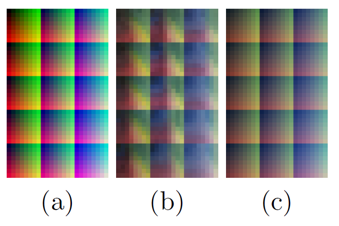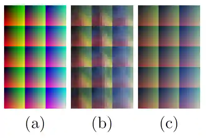除此之外,研究者们还针对光线和摄像头可能引起的潜在变化利用一种色谱图进行的模拟,如下图所示:(a)数字领域中的色谱图;(b)该图通过打印机打印到 T 恤只会在通过相机捕捉到的结果;(c)通过映射 a-b 学到的一种色彩变换。