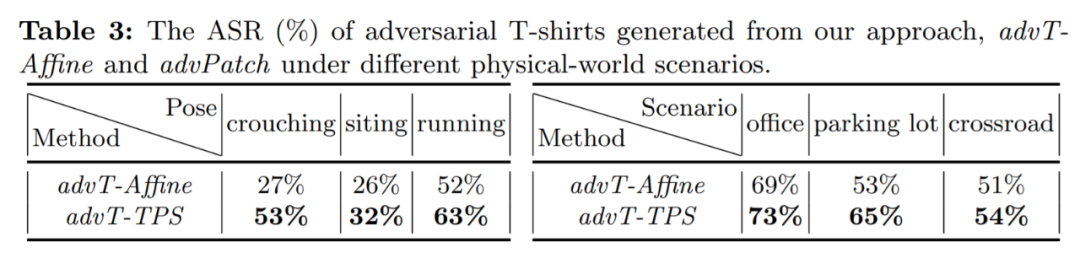 首先,研究者们在数字领域做了基础的比较试验,结果发现相较于非刚性变化—仿射变换,TPS 变化可以将攻击成功率在 YOLOV2 上从 48% 提升到 74%,在 Faster R-CNN 上由 34% 提升到 61%!这证明了对于柔性物体,加入 TPS 变化的必要性。