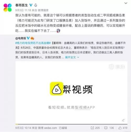 董明珠的这番言论立即引发行业热议,“春雨医生”在官方微博转发该新闻并评论道:“我认为是有可能的,就是这个锅可以根据患者的类型自动生成二甲双胍或胰岛素(格力可能还为此专门研发了口服胰岛素)加入到饭中,并且通过一系列复杂的反应把米饭中的碳水化合物变成膳食纤维,配合上面说的降糖药,可以实现敞开吃……我实在编不下去了……”