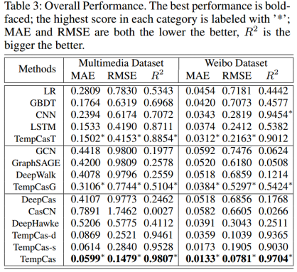 对比实验结果显示,所提方法 TempCas 在各项指标上均显著达到最佳。此外,将本方案的级联图嵌入部分(TempCasG)和其他图嵌入方案相比,本方案提出的级联图嵌入也达到了最优的转发量预测效果。
