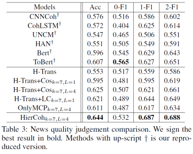 此外,微信搜索数据质量团队采集了微信平台上的新闻文章,并将描述同一个主题或事件的新闻组成新闻对,雇佣标注人员标注了这两篇新闻的质量哪个更好。共分为 3 个类别,类别 0 表示两篇新闻质量相近,类别 1 表示第一篇新闻质量更好,类别 2 表示第二篇新闻质量更好。研究者用孪生网络结构来建模两篇文章,然后合并最终的文章表示向量到 softmax 输出层,得到三分类概率,并用交叉熵作为损失函数来训练模型。实验结果如下,HierCoh 模型取得了最优的效果。