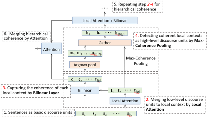 HierCoh 中最重要的部分是层次连贯性建模部分。该部分首先提取每个句子的局部上下文(local context block) 语义,然后得到句子跟该上下文的多维连贯性表示向量。研究者将句子视为最低级(low-level)的语义单元,然后基于这样一个假设得到高级 (high-level) 语义单元:如果连续的几个低级语义单元具有高连贯性,那么他们可以被视为一个高级语义单元。然后用同样的方式得到高级语义单元的连贯性,以及更高级的语义单元和他们的连贯性。研究者用 Local Attention 来提取局部上下文,用双线性层来建模多维连贯性,并提出了 Max-coherence Pooling 来提取高级语义单元。