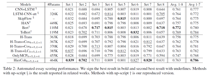 在自动作文打分任务上的结果如下表,可以看出 HierCoh 模型在作文题目 1-7 的集合上都取得了最优 / 较优的效果(作文集合 8 由于文章数量最少并且文章长度最长)。