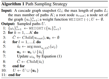 步骤 1:级联路径采样。社交中心和深度级联路径对级联图影响最大,而其他叶节点等几乎没有传播影响。为了充分获得级联图扩散特征,社交中心和深度级联路径是捕获级联图扩散特征的关键。为此,研究者设计了一个启发式的路径采样策略,如算法 1 所示。