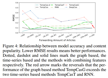研究者将多个方案的 RMSE 预测结果与相应的最终转发量相关上,并绘制了 Figure 4。可以看到,当面对热点内容时,基于级联图嵌入的方法往往比基于时间序列的方法具有更好的性能。