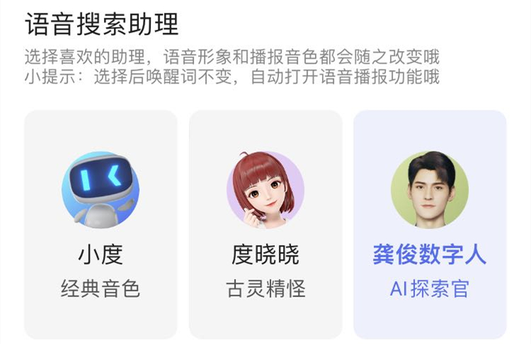 用户只需在百度 APP「语音设置」中的「语音搜索助理」中选定龚俊数字人,然后点击主页面下方的小话筒标志,即可唤出龚俊数字人,实现面对面的实时互动。