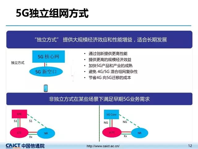5G标准分为非独立组网和独立组网两种模式。所谓独立组网就是采用5G新的空口接入到5G新的核心网,端到端都是完整5G的标准。非独立方式更多体现在核心网部分,也就是说,有些运营企业在初级阶段仍然用4G核心网接入5G新的接口作为过渡。
