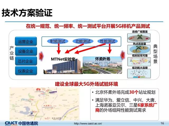 ▷ 在测试方面,目前约有七个厂参与了测试工作。在5G技术方案验证方面,已在怀柔、顺义搭建了大约30个基站,每个系统厂家是5个左右基站的外场环境,构建了全球最大的测试环境。