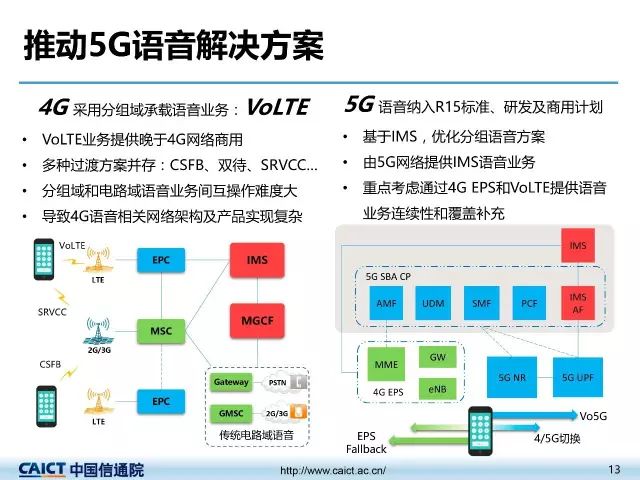 ▷ 在5G语音解决方案问题上,5G基本与4G类似,提供基于IMS语音业务,重点考虑通过4G EPS和VoLTE提供语音业务连接性覆盖补充。国内也在组织对多种语音方案的推进,希望在商用初期用户能够更好享受到语音的业务。