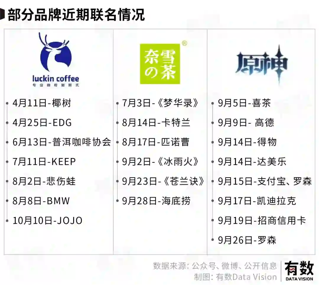 永璞咖啡堪称联名界交际花,拿下过400+次联名,一周可以换好几次CP;不轻易下凡的原神,也耐不住寂寞了,仅九月里就联名了近10次,而去年同期官宣的联名仅有一次;就连特斯拉也要和Manner一起卖个咖啡。