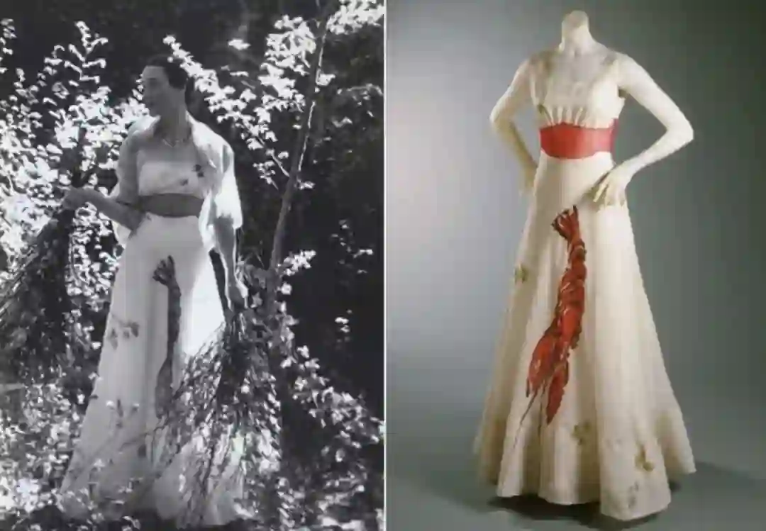 这种形式堪称是品牌联名的祖师爷。早在1937年,意大利设计师Elsa Schiaparelli突发奇想,找来达利一起做了一条龙虾印花裙,疯狂的达利再加上与时尚不沾边的食材元素,这条横空出世的裙子让整个时尚圈为之振奋。彼时的著名KOL温莎公爵夫人立马成为龙虾裙的拥趸,经其发扬光大,龙虾裙得以名垂时尚史。
