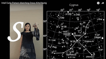 在你不挥手的时候,裙子上看不到任何图案;但如果你拿着开发板一挥,这条裙子就会显示出四种相应星座的图案:猎户座、天鹅座、北斗七星、天宫座。
