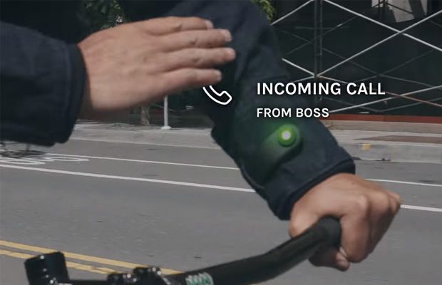 它能让你在骑车时通过点击、划线这件夹克的左袖口控制音乐、接听电话、或者查导航信息,不用在骑车时边骑车边看手机,也就更安全: