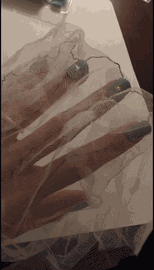 除了墨镜,Kitty 甚至连女孩子的指甲都考虑到了:她最近开发出来的样品是一个可以闪的手指甲,每个指甲连着蕾丝,蕾丝连着正极和负极的导电线,把一个小的 LED 灯放在指甲贴片后面时,灯就会闪个不停: