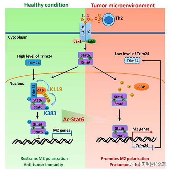9月25日,国际学术期刊《Nature Communications》在线发表了中国科学院上海营养与健康研究所肖意传研究组与秦骏研究组合作的最新研究成果“Modulation of M2 macrophage polarization by the crosstalk between Stat6 and Trim24”。该研究揭示了Stat6乙酰化调节巨噬细胞M2极化,进而影响体内抗肿瘤免疫的作用机理,为抗肿瘤免疫的调控提供了新的分子靶标。 肿瘤微环境中的免疫细胞构成了肿瘤中的免疫调节系统,其中具有M2型特征的TAMs(tumor associated macrophages, TAMs)在抑制抗肿瘤免疫并促进肿瘤进程中起到了重要的调控作用,然而TAMs向M2极化精细调控的分子机制仍不清楚。该研究发现在巨噬细胞M2型极化过程中,调控极化的关键转录因子Stat6可以发生CBP介导的K383位点乙酰化修饰,该位点的乙酰化修饰能够明显抑制Stat6的转录活性以及下游M2型特征基因的表达。随后,通过高通量转录组测序(RNA-seq)结合蛋白质谱分析,研究人员发现了一种Trim家族蛋白的E3泛素连接酶Trim24能够与乙酰基转移酶CBP结合,介导CBP蛋白K119位点K63连接的泛素化修饰,增强CBP对Stat6的招募并促进CBP介导的Stat6蛋白K383位点乙酰化修饰,从而抑制Stat6的转录活性以及巨噬细胞的M2型极化。 进一步的体内研究表明,Trim24基因在巨噬细胞中缺失后抑制了肿瘤微环境TAMs中Stat6蛋白K383位点的乙酰化修饰,进而促进了TAMs向M2方向的极化,由此促进了肿瘤的生长。研究人员还发现,乳腺癌病人肿瘤组织中TAMs相较癌旁正常组织中巨噬细胞表达更低水平TRIM24与更高水平的M2基因,且肿瘤细胞条件性培养基能明显抑制人单核或巨噬细胞中TRIM24表达。这些结果提示肿瘤微环境可能通过抑制TAMs中Trim24的表达进而抑制Stat6的乙酰化,从而进一步促进了TAMs向M2方向极化,并维持了肿瘤中免疫抑制性的微环境状态。因此,靶向Stat6乙酰化修饰或者Trim24活性可以作为肿瘤免疫干预的潜在分子靶标。 营养与健康所博士后于涛和博士生甘叔诚、朱清晨为论文共同第一作者,研究员肖意传和秦骏为共同通讯作者。该研究得到江苏大学附属医院教授毛朝明、上海交通大学医学院附属瑞金医院教授沈坤炜等的大力帮助。该研究还得到科技部、国家自然科学基金委及中科院等的资助,同时也得到营养与健康所公共技术平台和动物平台的支持。 Stat6乙酰化调节抗肿瘤免疫的分子机制