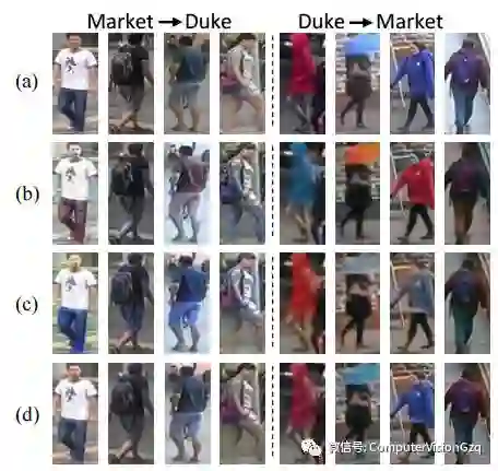 图2为分别来自于Duke和Market的图像示例,可以观察到两个数据集合有着很大的风格差异,具体体现在不同光照、背景、季节等上。基于数据集合风格差异的观察,作者从图像风格迁移的角度来对行人重识别的迁移学习进行探索: