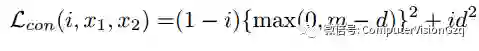 公式2为contrastive loss,x1和x2为输入的图像样本对,i为输入图像对的标签,i为1表示是输入的图像对是正例对,i为0表示是输入的图像对是反例对,m表示反例对之间距离margin,m为两个输入样本的欧式距离: