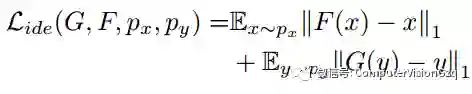 该loss具体为:假定一个generator是从域S 映射到域T ,那么来自于域T 的样本通过该generator得到的还是该样本。下公式为target domain identity loss。作者实验发现,该loss能够使得迁移前后的图像在颜色组成上保持一致。