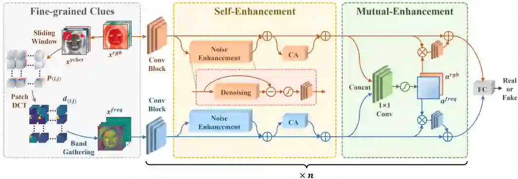 为了解决上述问题,本文提出了一种渐进式的增强学习框架来同时利用RGB信息和细粒度的频率信息。首先,本文基于滑动窗口和离散余弦变换将输入RGB图像转换成细粒度的频率分量,来充分在频域空间对真假痕迹解耦。随后,本文基于双流网络引入了自增强模块和互增强模块,其中自增强模块可以捕捉不同输入空间下的篡改痕迹,而互增强模块可以互补加强双流的特征交互。通过这种渐进式的特征增强流程,能够有效利用细粒度的频率信息以及RGB信息来定位细微的伪造痕迹。