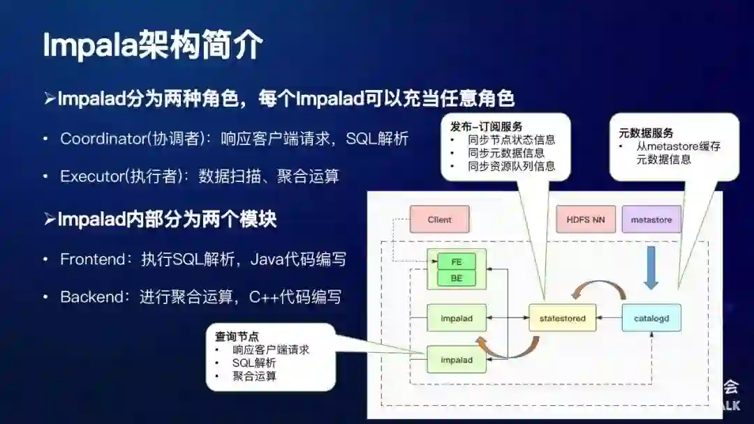 需要注意的是,在一个Impala集群中,statestored和catalogd只有一个,Impalad节点有若干个。由于coordinator需要进行执行计划解析,因此需要缓存元数据在自己的内存中。实际线上部署的时候,我们一般会将coordinator和executor分开,同时集群中只有配置少量几个coordinator节点,大部分都是executor节点。