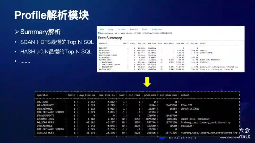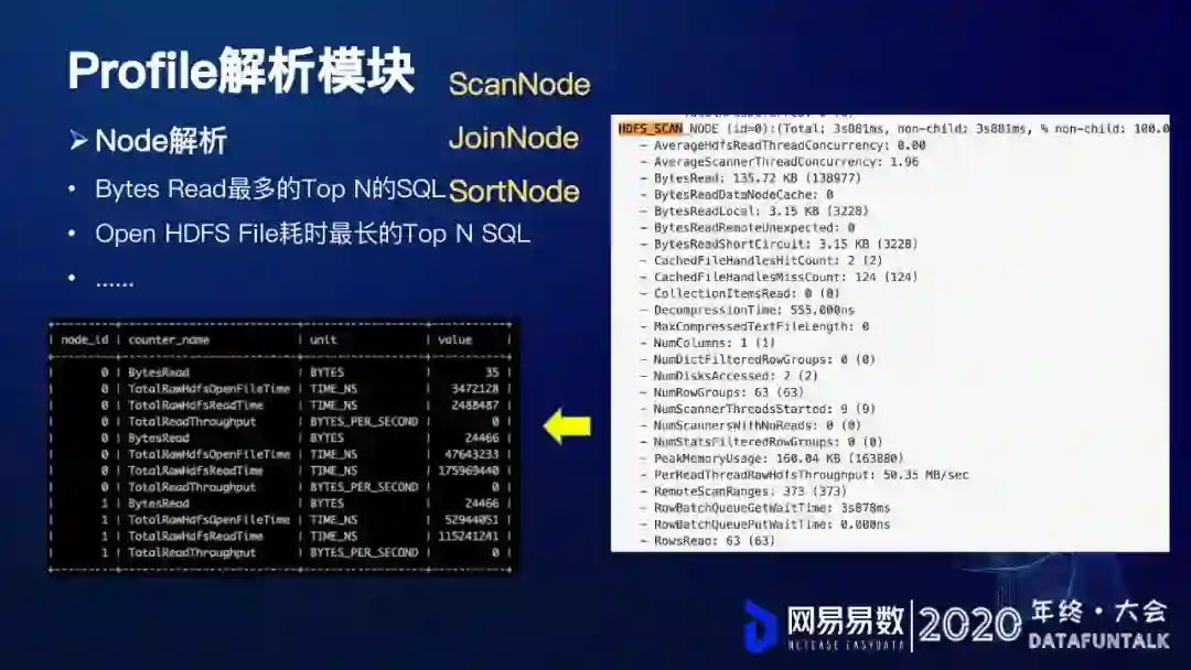 Node分为ScanNode、JoinNode、SortNode。上图是典型的HTFS_SCAN_NODE,它包含了很多的指标。从截图中看到,像读取的字节数,本地读取的字节数,读取的函数等等,这块都是有展示的。我们将这些指标都提取出来,然后解析成一条一条的记录存储到Mysql表当中。