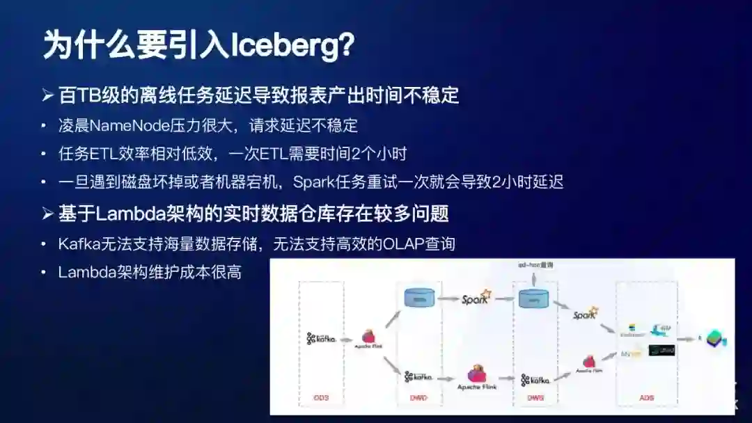上图目前我们网易内部的一个数仓架构图,可以看到,维护实时和离线两条线路,本身涉及到的组建也比较多。关于这块相关的情况,之前也有同事做过Iceberg相关的分享,这里就不再展开了。