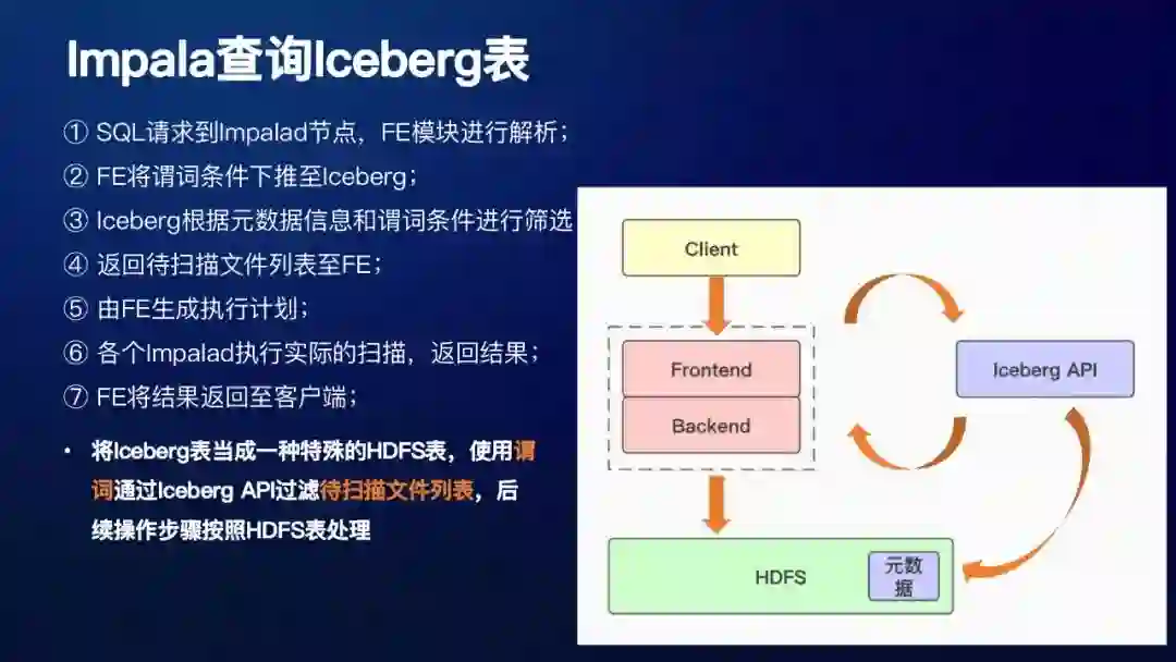 总结下来就是:将Iceberg表当成一种特殊的HDFS表,使用谓词通过Iceberg API过滤待扫描文件列表,后续操作步骤按照HDFS表处理。这样设计的好处,就是可以复用大量的Impala代码(Impala的SCAN都是在BE模块,用C++实现的)。