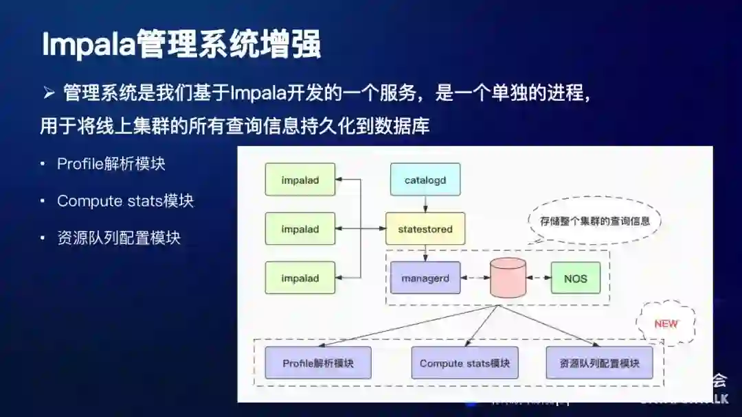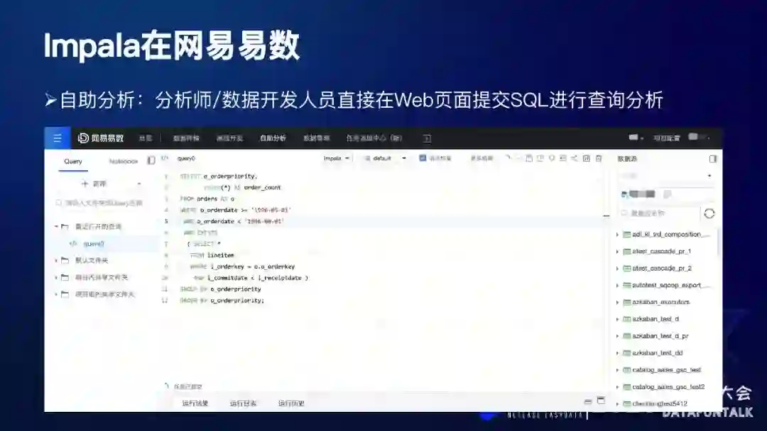 导读:Impala是Cloudera公司主导开发的交互式查询系统,它提供SQL语义和计算能力,但是本身并不存储数据。本次分享会聚焦于Impala在网易内部的一些新实践,以及基于Impala 3.4版本所做的优化和改进。