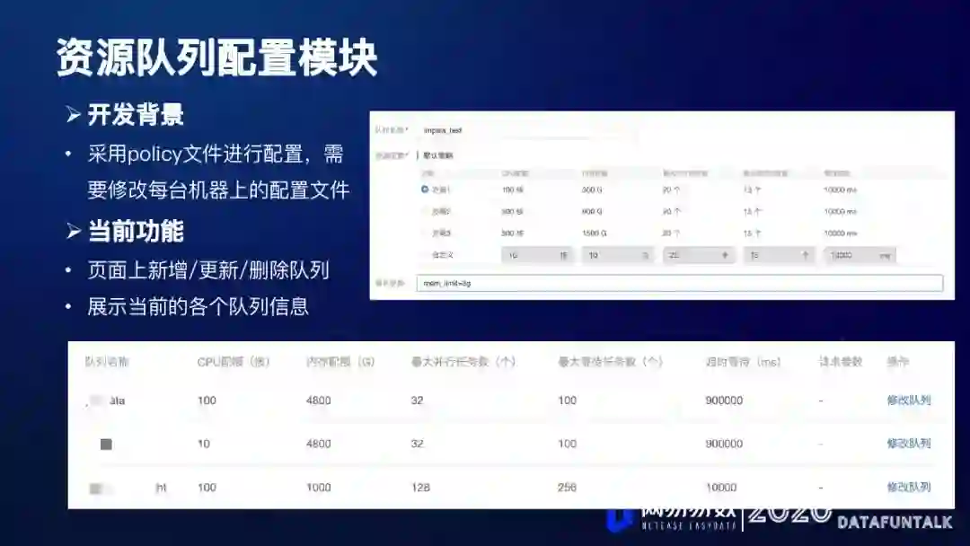 在Impala2.12的时候,采用policy文件进行配置,需要修改每台机器上的配置文件,新增或者修改一个队列的话,就需要在所有的机器上把配置文件进行修改(可以只配置coordinator),这样比较麻烦,不利于运维。基于这个情况,我们就开发了资源对列配置模块。主要有以下这些功能: