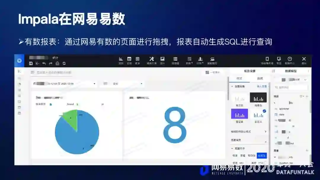 另外一个使用场景就是:网易有数,作为一款BI工具,它提供了一个图形化界面,用户只需要在这个页面上进行相应的一些拖拽操作,系统会自动地生成相应的SQL,发到Impala,根据Impala的查询结果,以图形化的界面形式展示给用户。用户不需要关注具体的SQL编写,只需要在页面上进行一些简单的控件拖拽,就可以获取相应的图标展示,非常方便。