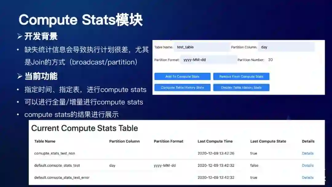 统计信息计算模块,Impala之前对于统计信息的依赖是非常重的,如果说这个表没有统计信息的话,它的执行计划有时候会非常的差,尤其是我们Join的方式。我们所说的统计信息通常会包括像每个列的最大值,最小值,还有它的distinct值等,这些我们都可以称之为统计信息。基于这个原因,网易目前开发了这样一个模块,它主要包括这三个功能:
