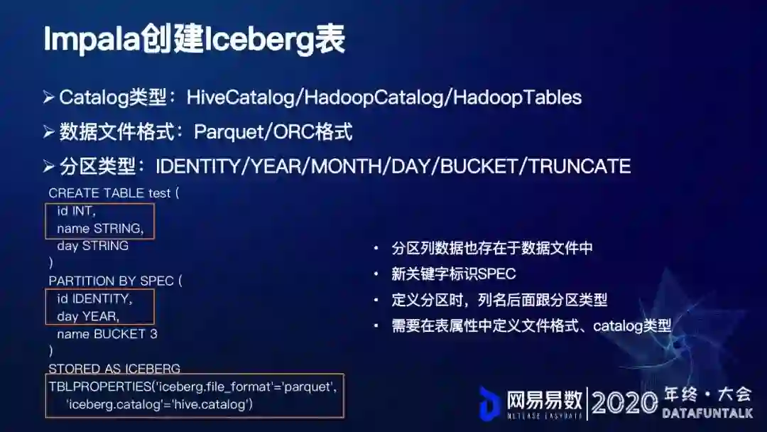 这是Impala创建Iceberg表的一个SQL,首先我们知道Hive的分区列只是一个逻辑上的概念,是HDFS上的一个目录层级。但是Iceberg表的分区列的数据,在底层的数据文件中也是存在的,所以在建表的时候,分区列也必须位于表名后面。第二点是新增了一个关键字SPC,如果要创建Iceberg分区表的话,必须要指定关键字SPEC。第三点就是我们在定义分区的时候,列名后面跟的是分区类型,而Hive后面跟的是列的类型。最后一点需要注意的是,需要在TBLPROPERTIES中指定各个属性。因为Iceberg在Impala中是一个表格式,有不同的数据文件,所以目前采取的方式是在表属性中对这些属性进行相应的定义。总结一下,有以下几点: