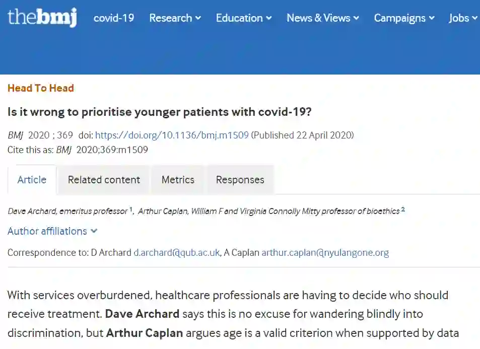 他指出,数十年来,在合理分配救生性治疗方法(例如获得肾脏透析和器官移植)时,年龄在限制获得治疗方面一直发挥着重要作用。关键的道德问题是,在不可避免的情况下,年龄本身是否是决定谁得到相关照顾的道德相关因素。