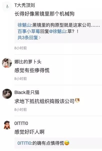 价格只是一方面原因,其「瘆人」的外形,同样构成 SpotMini 未来被普及的障碍。在今日的卡车视频发出后,我们发现网友们的回应基本如下: