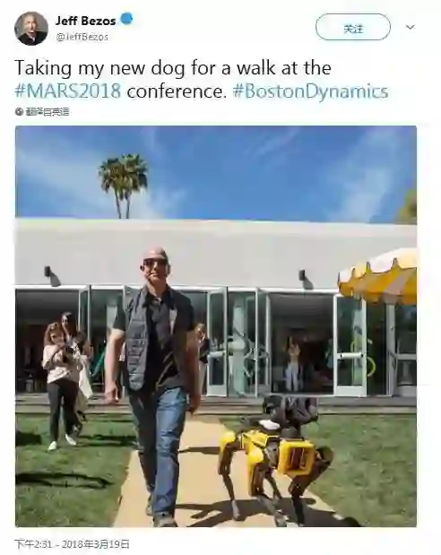 去年 3 月 19 日,亚马逊公司创始人、董事长兼 CEO 杰夫·贝索斯发布 Twitter 称,「在 MARS2018 会议上,带着我的新狗散步」——MARS 是亚马逊组织的机器人大会,一年举办一次,只有受邀者才能参与,会议的主题涵盖机器学习、自动化、机器人技术和太空探索。