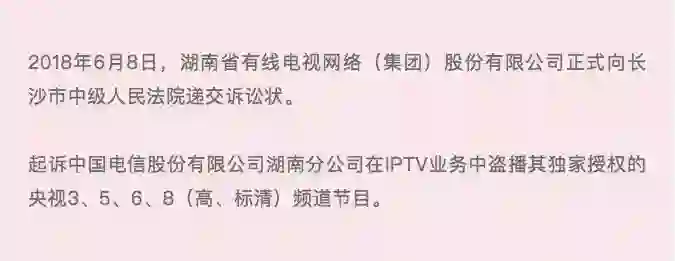 湖南有线表示,已经于6月8日向长沙市中级人民法院递交诉讼状,起诉湖南电信盗播其独家授权节目,强调湖南有线是该地区观看世界杯的唯一合法途径。
