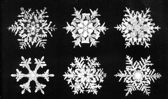 各种形状的雪花,出自 W.A. Bentley & W.J. Humphreys (1931) 出版之图书 Snow Crystals。