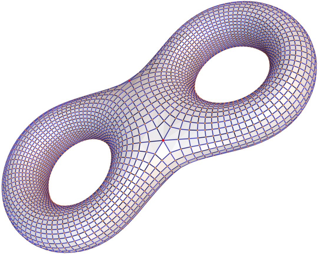 我们再来考察三维流形。如图9所示,假设三条蛀虫在苹果中打穿了三条彼此缠绕的隧道,如此得到的流形容许一个双曲度量,使得边界表面成为双曲曲面,其覆盖空间在三维双曲空间中的等距嵌入显示在右帧。任意一个三维流形,如果容许双曲度量,被称为是双曲三流形。