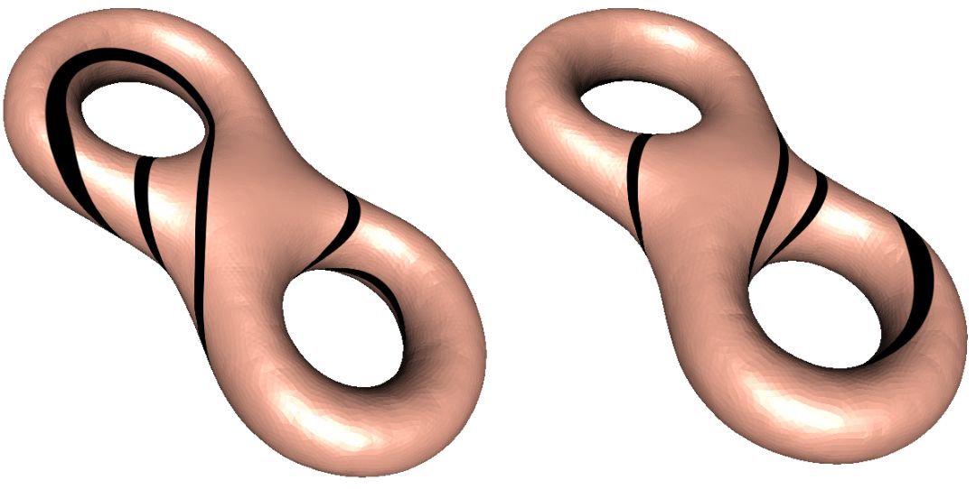 哈迪德为之终生迷恋的叶状结构(foliation)在拓扑和微分几何中起到了至关重要的作用。1980年代,低维拓扑领域发生了天翻地覆的变化,这场革命的领导者Thurston和Sullivan就是应用foliation洞察了三维流形的结构,很多突破就是在highline下的曼哈顿发生。如图7所示,每个高亏格曲面都可以配备双曲度量。固定一个拓扑曲面,其上所有可能的双曲度量构成了Teichmuller空间。