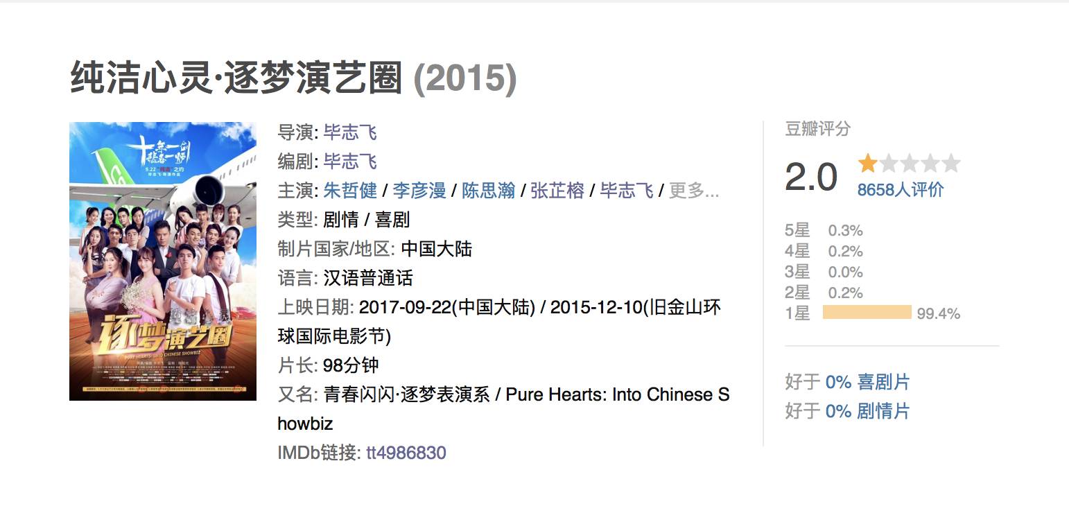 他花了12年才拍出来的,反映年轻人拒绝演艺圈潜规则的正能量电影《纯洁心灵·逐梦演艺圈》,在豆瓣上被打了2分的超低分,要知道豆瓣是没有1分和0分的。不过估计豆瓣接下来评分机制可能调整,因为人民群众在这部片子之后强烈呼吁可以打0分。豆瓣网友巴豆评论:“这个电影是完完全全彻彻底底的一星电影,槽点密布,基本是个偶像剧版道德说教PPT,旁白根本停不下来,人物极多,但都没什么屌用。”