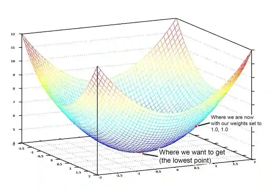所以我们只需要调整权重,在这个图上“下山”到最低点。如果我们不断地对权重进行小的调整,使其始终向最低点移动,我们最终就会不需要尝试太多权重的情况下到达最低点。