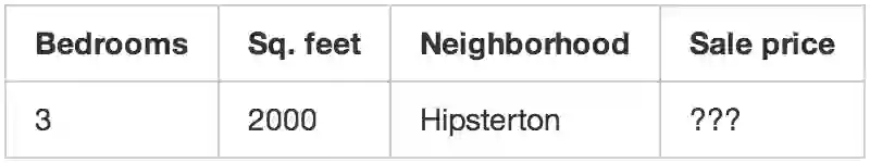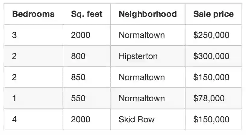 因此,每当有人在你所在城市出售房屋,你都需要记录下来,持续 3 个月。对于每套房子,你都要记录大量细节:卧室的数量、平方英尺为统一单位的面积、社区等。但最重要的是,你要记录最终的销售价格: