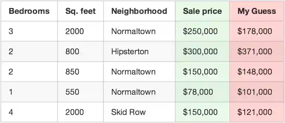 假设你是一个房地产经纪人。你的业务正在增长,因此你聘请了一批新的实习生来帮助你。但是有一个问题:你能够随便看一下房子就能对房子的价格有一个很好的估计,但是你的实习生没有你的经验,所以他们不知道该如何定价。