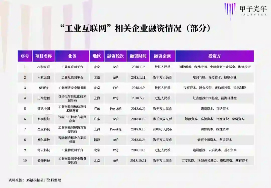 一级市场,据不完全统计,2018年有40多家工业互联网公司获得了融资,相较于2017年增长了一倍多,其中近亿元的大额融资有4起。