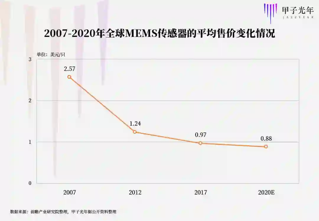 2007年-2020年全球MEMS传感器的平均售价变化情况(单位:美元/只)